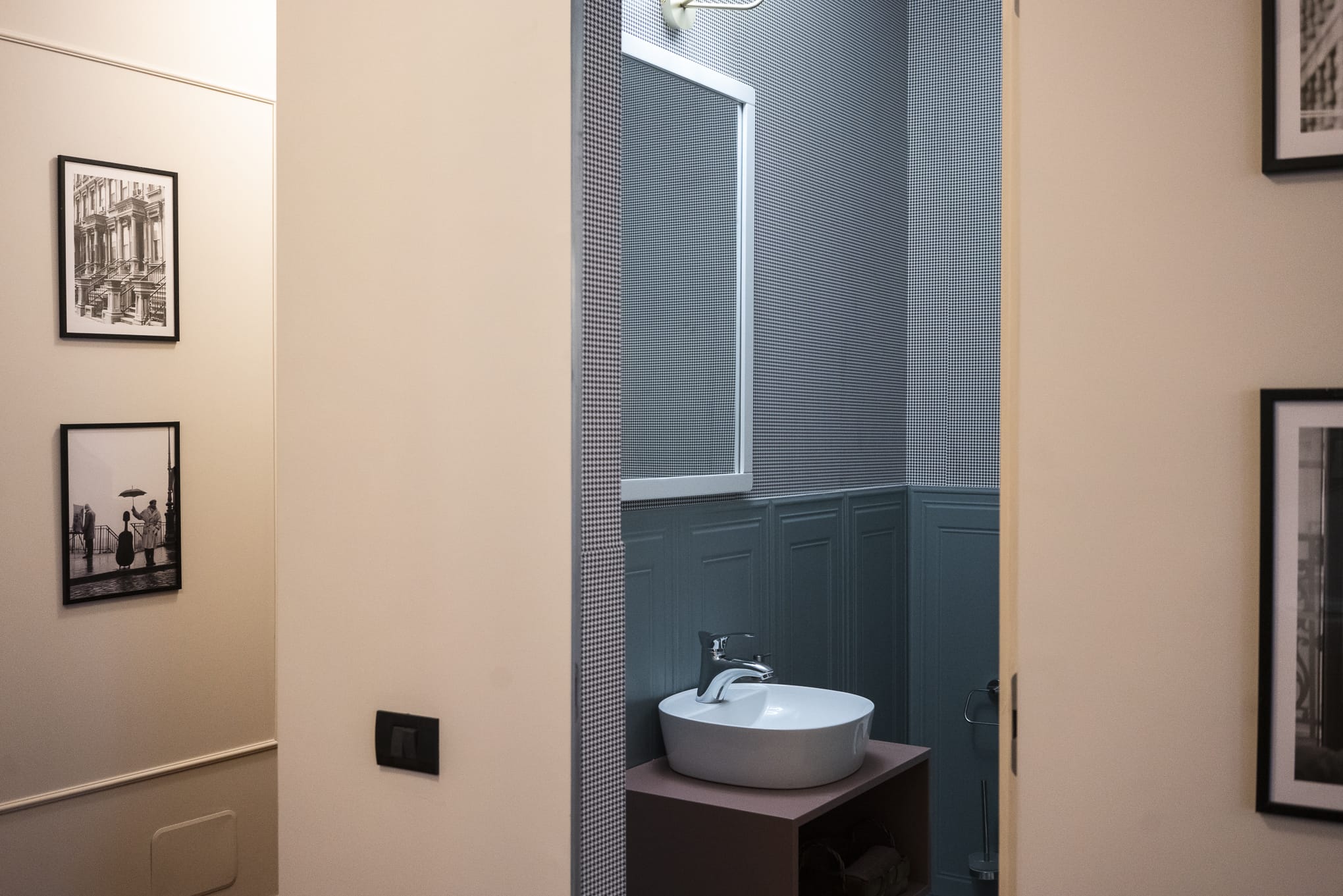 Lavoarul rotund montat pe blat este pus în valoare de textura panourilor decorative albastre, într-un stil ce reinterpretează eleganța clasică într-o notă actuală. Combinația dintre robinetaria cromată, mobilierul în nuanțe neutre și peretele tapetat creează o baie cu o identitate vizuală clară, potrivită atât pentru băi principale, cât și pentru băi de oaspeți sau spații secundare cu personalitate.
